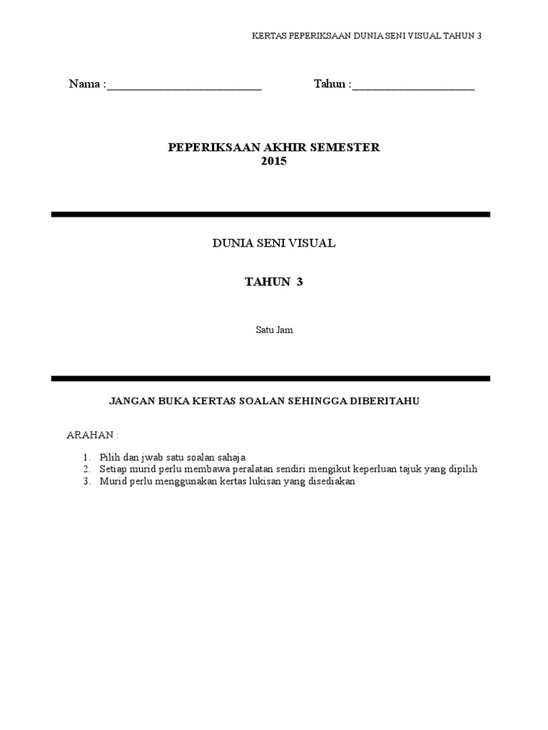 Soalan Kssr Peperiksaan Akhir Tahun Subjek Dunia Seni Visual Tahun 3