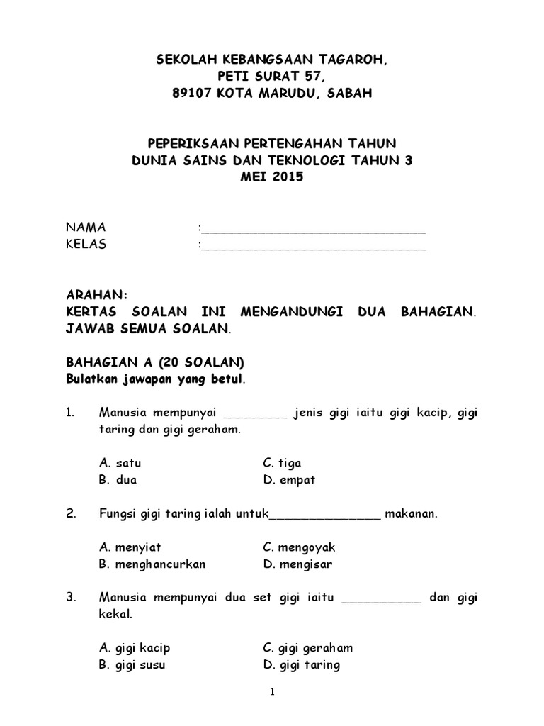 Pdf Ujian 1 Kertas 1 Dst Tahun 3 2016 Norazlin Mohd Rusdin