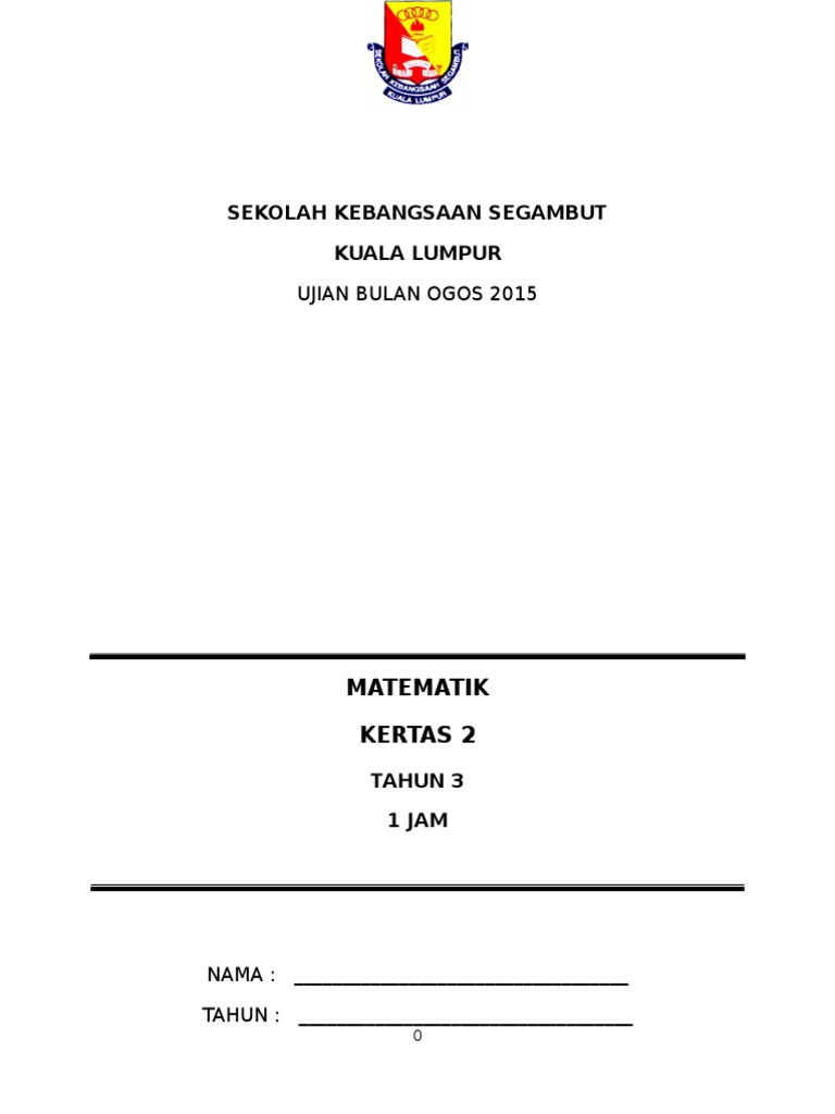Matematik Tahun 3 Ujian Ogos Kertas 2 2015