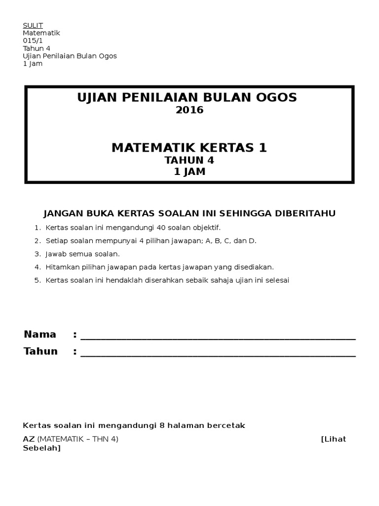 Soalan Ujian Bulan Ogos Matematik Tahun 4 Kecemasan M